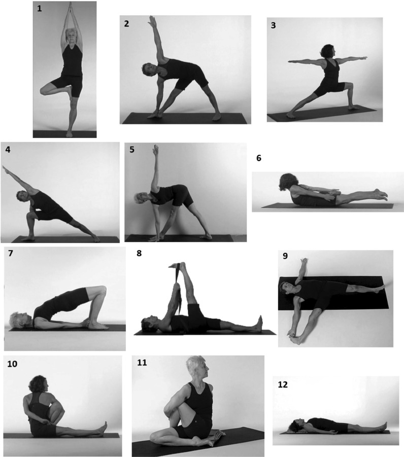 (1) Vriksasana—tree, (2) Trikonasana—triangle, (3) Virabhadrasana II—warrior II, (4) Parsvakonasana—side-angle pose, (5) Parivrtta Trikonasana—twisted triangle, (6) Salabhasana—Locust, (7) Setu Bandhasana—bridge, (8) Supta Padangusthasana I—supine hand-to-foot I, (9) Supta Padangusthasana II—supine hand-to-foot II, (10) Marichyasana II—straight-legged twist, (11) Matsyendrasana—bent-knee twist, (12) Savasana—corpse pose.