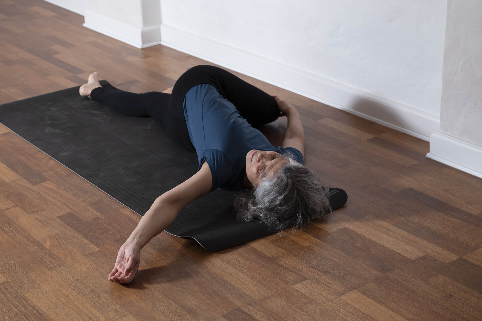 Lig på ryggen. Placer højre fodsål oven på venstre knæ og drej højre knæ helt i gulvet til venstre. Lad være med at flytte på hoften men lad den blot rotere med. Højre hånd løftes skråt op til højre med håndfladen opad. Kig op efter den højre arm.